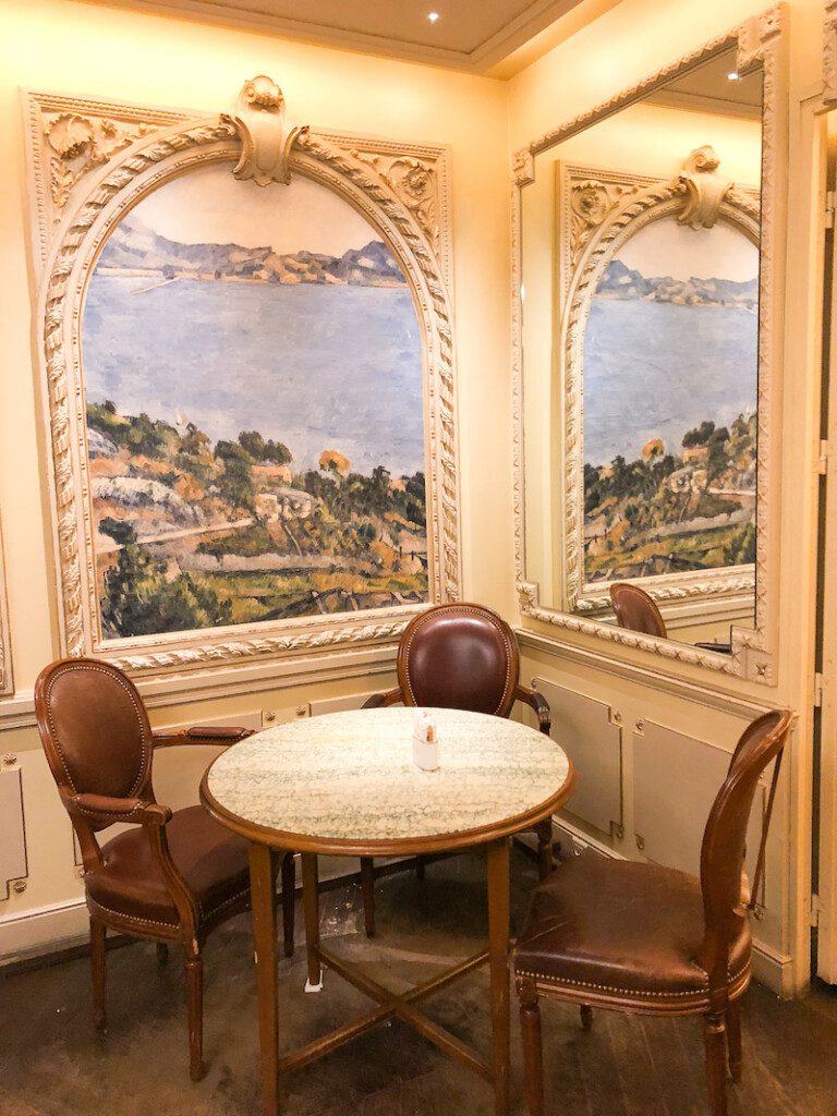 The main room is jam packed with tables. The ceiling looks like you are sitting in a gazebo, patches of blue sky showing through (although this one is just for show). The walls have dreamy scenes of the country views from your gazebo. If it wasn’t for all the tourists….so many tourists. Most are devouring a Mont-Blanc, Angelina’s most famous pastry based on a recipe that has remained unchanged since they opened. My heart has already been stolen by my local pastry shop, so I focus solely on the hot chocolate today.