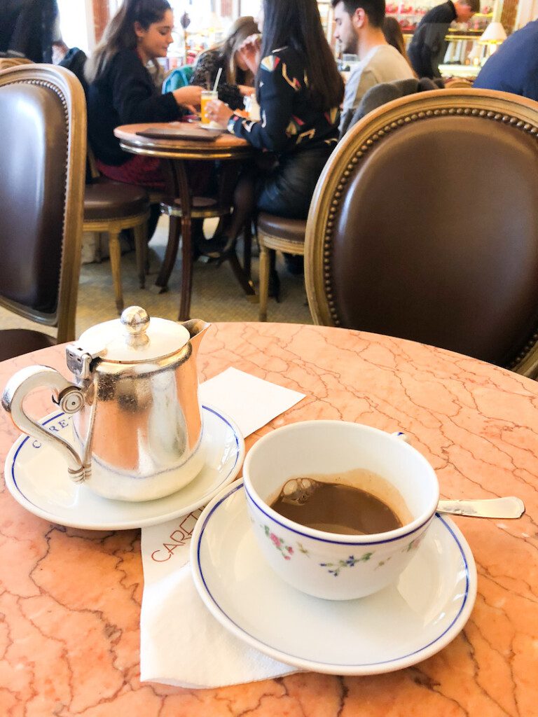 Carette feels more like a bistro than a pastry shop, a very fancy bistro though. Everyone here this morning either works or lives locally and there is not a tourist in sight. I stand mesmerized in front of the display case for longer than I am allowed. It is so unbelievable that I admit I cheated on my usual favourite pastry shop and tried these ones (sorry….but not sorry). Actually, to be completely honest, I also bought a pain au chocolate (I also got a bit of a look from the woman at the counter…perhaps wondering why I would indulge myself so much. It was a bit of a ‘control yourself honey’ kind of look but I ignored it). If you add to that my 9euro hot chocolate, this was a pretty serious snack.
