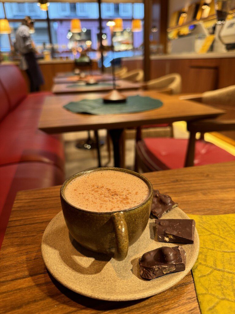The hot chocolate is made with your choice of either dark or milk chocolate melted into warm oat milk. The staff, who every time I visited were so generous with their time, smiles and knowledge, offer to grate fresh Tonka bean on top and serve the hot chocolate with a selection of samples of their different chocolates. The seating area is warm, cosy and colourful with a range of chocolate themed reading material if you are sipping alone and loungy Brazilian tunes to transport you far, across the ocean, where it is much sunnier, and warmer than it is today in Paris.