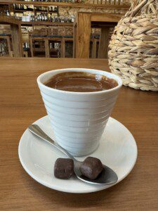 L’Esperantine is a beautiful little chocolate shop located in the Panier neighbourhood of Marseille, one of France’s biggest and most interesting cities. Within a few blocks they have both a shop front and a cafe where you can sit and enjoy their chocolates, ice creams and, of course, hot chocolate. The company, founded in 1999 by Francesco Martorana, is famous for their chocolates made with added olive oil and shaped like olive leaves. They also put the flavours of local almonds and orange front and centre in many of their products. They don’t make the chocolate itself and are chocolatiers, making products with chocolate they buy. No information was shared in store about where that chocolate is from or how it is made.