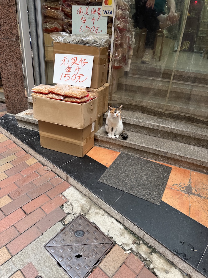 Lok (the genius behind Slok) gave me a list of café’s that serve the drinking chocolate in Central so we made a plan. Three hot chocolates in a row? Totally doable. So, we set off. We wandered past shops selling Chinese medicinal ingredients, piles of dried everything spilling from open bags and guarded, in almost all cases, by a resident cat (presumably paid in rats). Narrow trams zipped by us on the main road. We turned left and follow a local with a very cute dog up a steep set of steps and into what was clearly his daily coffee stop. Sometimes I follow interesting looking locals when I travel (in a non-creepy way I promise), just to get off the beaten path. This time, though, the café was our destination too. The other two cafes on our list were both unexpectedly closed today due to private engagements so by the time we got here we had unreaslistically high expectations.