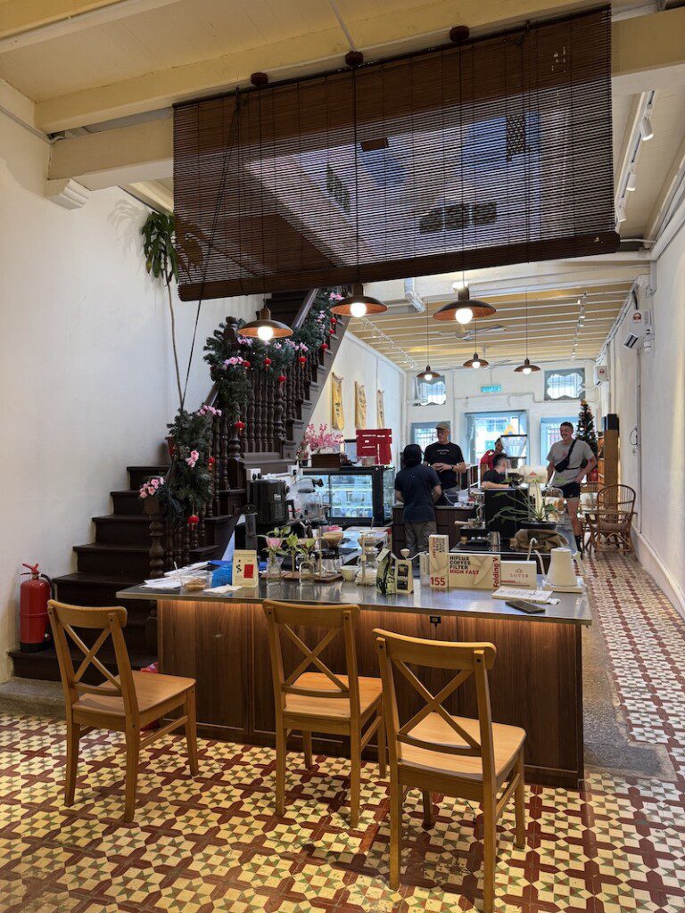 We admired the decorative floor tiles at Ossa Roastery while waiting for The decorative floor tiles originally came from Europe and became associated as a status symbol. Many of the shophouses in the UNESCO World Heritage Precinct of Georgetown have these colourful tiles, each one different. These usually cover the inside floor as well as the outside covered walkways of each shophouses which, traditionally, has been five feet wide. The fun bit is that everyone seemed to have a different idea of what five feet wide meant, so the different buildings don’t line up exactly, which only adds to the charm of the neighbourhood.