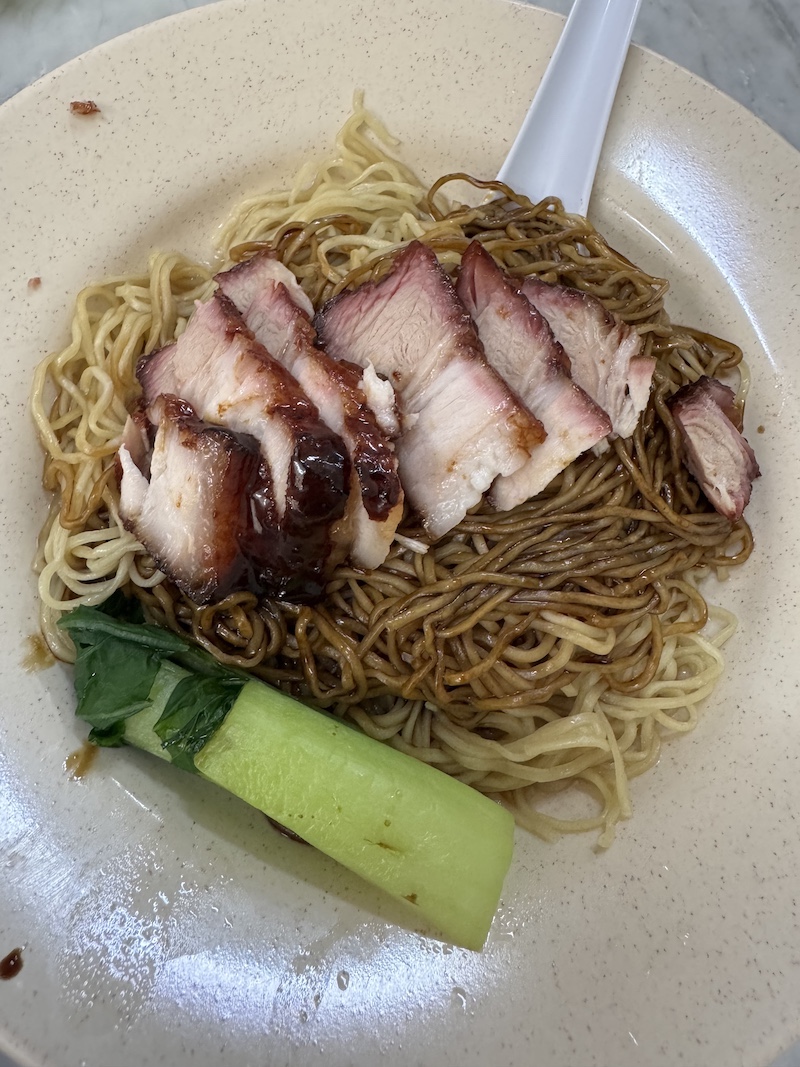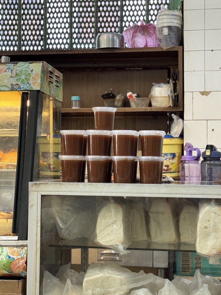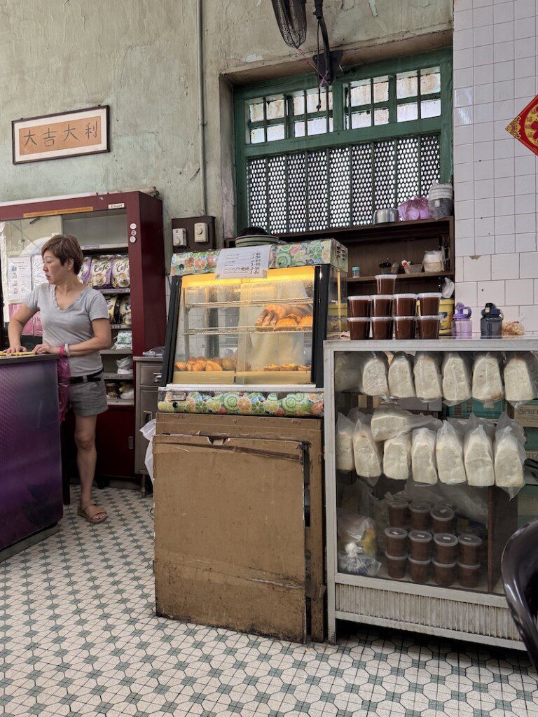 But while the drinks are generally the same at all the Kopitian, it is the food that varies. Sin Yoon Loong has a selection of curry buns that are delicious. At the front entrance there is a man making noodles with pork. The portions are small, good for breakfast or to also leave space to order other things as well. Once I started eating noodles for breakfast, I wondered why Western countries are so enamoured with dry cereal. Noodles is the way to go and these ones were outstanding. One also has to order kaya toast, toasted white bread slathered with butter and kaya jam, a jam made of coconut and panda. We tasted a lot of kaya jam and this one was one of our favourites.
