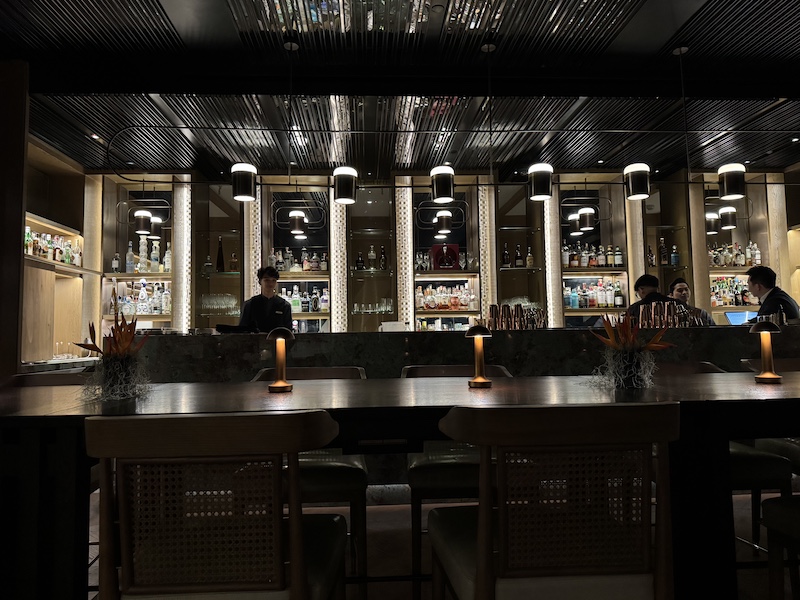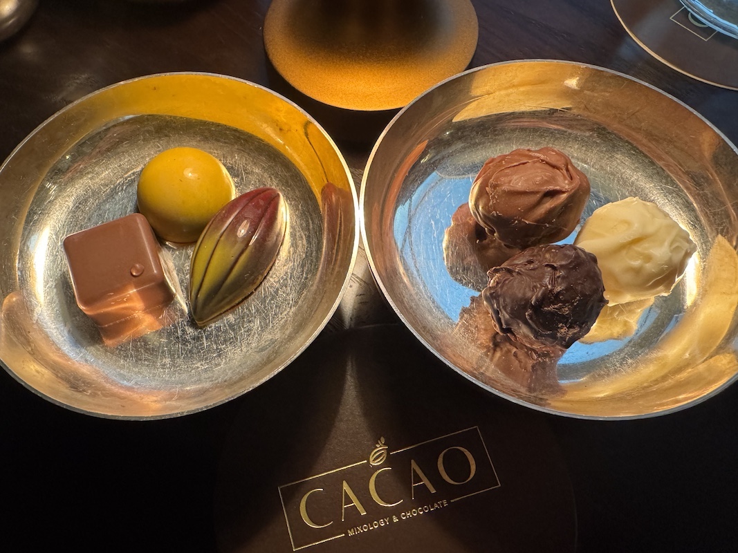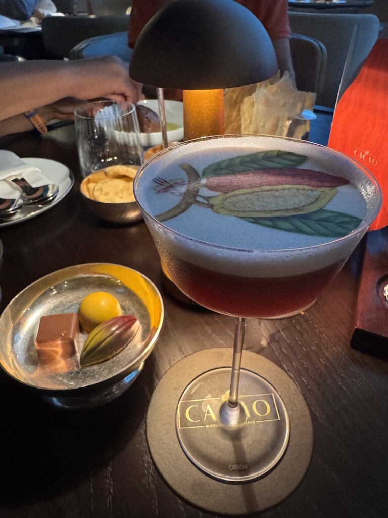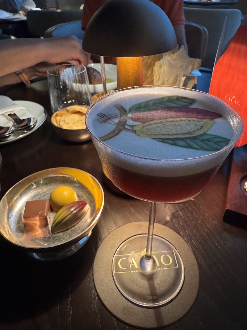 Then the chocolate started arriving. A series of bonbons and truffles, all technically perfect. Their signature cocktail, The Cacao Club made with whisky, chocolate, and a touch of durian, and topped with a cocoa pod-printed rice paper was enjoyable. Some of the desserts were good, but not as memorable as I’d hoped. A chocolate mousse, for example, was perfectly fine—but “perfectly fine” isn’t really what you’re looking for in a place like this. It needed more depth, more character.